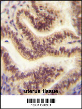 - CP045 antibody (Center) immunohistochemistry analysis in formalin fixed and paraffin embedded human uterus tissue followed by peroxidase conjugation of the secondary antibody and DAB staining. This data demonstrates the use of the CP045 antibody (Center) for immunohistochemistry. Clinical relevance has not been evaluated.