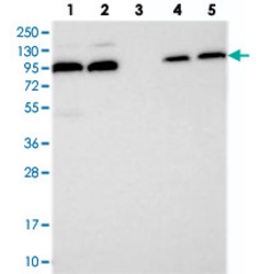 - Western blot analysis of Lane 1: RT-4, Lane 2: U-251 MG, Lane 3: Human Plasma, Lane 4: Liver, Lane 5: Tonsil with FAM179A polyclonal antibody (Cat # PAB23133) at 1:250-1:500 dilution.
