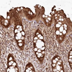 - Immunohistochemical analysis of FAM179A in human colon using FAM179A Polyclonal Antibody (Product # PA5-58006) shows strong nuclear and cytoplasmic positivity in glandular cells.