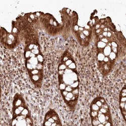 - Immunohistochemistry-Paraffin: FAM179A Antibody [NBP1-93765] - Staining of human colon shows strong nuclear and cytoplasmic positivity in glandular cells.