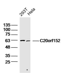 - Lane 1: 293T cell lysates; Lane 2: Hela cell lysates probed with C20orf152 Polyclonal Antibody, Unconjugated (bs-15097R) at 1:300 dilution and 4°C overnight incubation. Followed by conjugated secondary antibody incubation at 1:20000 for 60 min at 37°C.