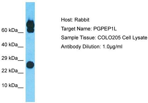 - Host: Rabbit; Target Name: PGPEP1L; Sample Tissue: COLO205 Whole Cell lysates; Antibody Dilution: 1.0ug/ml