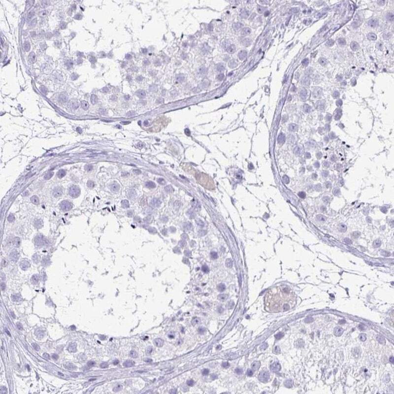 - Immunohistochemical staining of FAM162B in human testis using FAM162B Polyclonal Antibody (Product # PA5-63843) shows low expression as expected.
