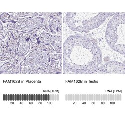 - Immunohistochemical staining of FAM162B in human placenta and testis tissues using FAM162B Polyclonal Antibody (Product # PA5-63843). Corresponding FAM162B RNA-seq data are presented for the same tissues.