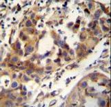 - CCDC17 antibody immunohistochemistry of formalin-fixed and paraffin-embedded human breast carcinoma followed by peroxidase-conjugated secondary antibody and DAB staining.