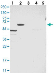 - Western blot analysis of Lane 1: RT-4, Lane 2: U-251 MG, Lane 3: Human Plasma, Lane 4: Liver, Lane 5: Tonsil with CCDC17 polyclonal antibody (Cat # PAB22737) at 1:250-1:500 dilution.