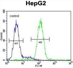 - CCDC17 Antibody (C-term) (Cat. #AP50772PU-N) flow cytometric analysis of HepG2 cells (right histogram) compared to a negative control cell (left histogram).FITC-conjugated goat-anti-rabbit secondary antibodies were used for the analysis.