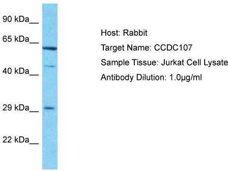 - Host: Rabbit; Target Name: CCDC107; Sample Tissue: Jurkat Whole Cell lysates; Antibody Dilution: 1.0 ug/ml