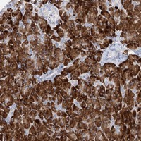 - Immunohistochemical staining of human pancreas with CCDC107 polyclonal antibody (Cat # PAB22733) shows strong cytoplasmic positivity in exocrine glandular cells at 1:50-1:200 dilution.