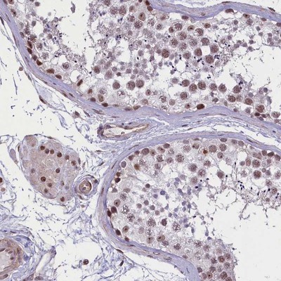 - Immunohistochemistry-Paraffin: C19orf66 Antibody [NBP1-90417] - Staining of human testis shows moderate nuclear positivity in cells in seminiferus ducts and Leydig cells.