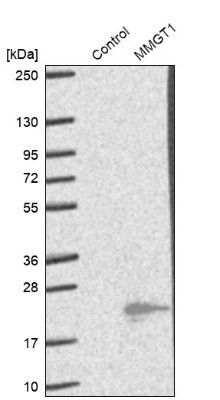 - Western Blot: MMGT1 Antibody [NBP1-90652] - Analysis in control (vector only transfected HEK293T lysate) and MMGT1 over-expression lysate (Co-expressed with a C-terminal myc-DDK tag (3.1 kDa) in mammalian HEK293T cells).