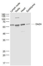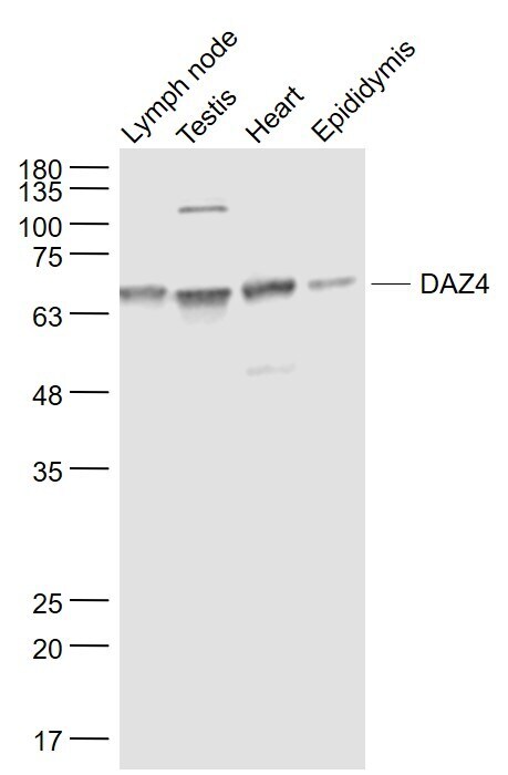 - Lane 1: Mouse lymph node lysates; Lane 2: Mouse testis lysates; Lane 3: Mouse heart lysates; Lane 4: Mouse epididymis lysates probed with DAZ4 Polyclonal Antibody, Unconjugated (bs-13609R) at 1:1000 dilution and 4°C overnight incubation. Followed by conjugated secondary antibody incubation at 1:20000 for 60 min at 37°C.