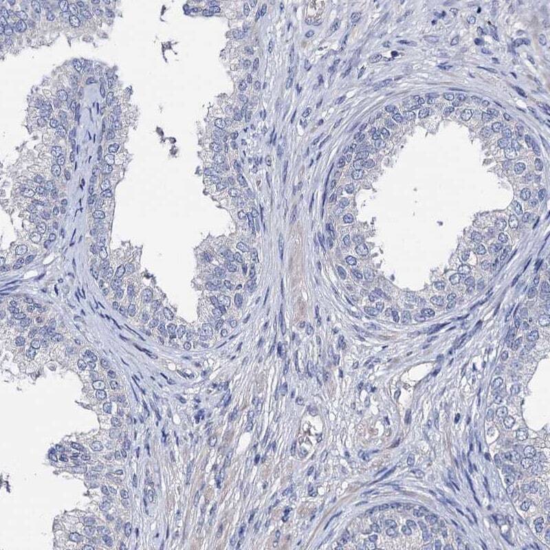 - Immunohistochemical staining of C11orf66 in human prostate using C11orf66 Polyclonal Antibody (Product # PA5-58647) shows low expression as expected.
