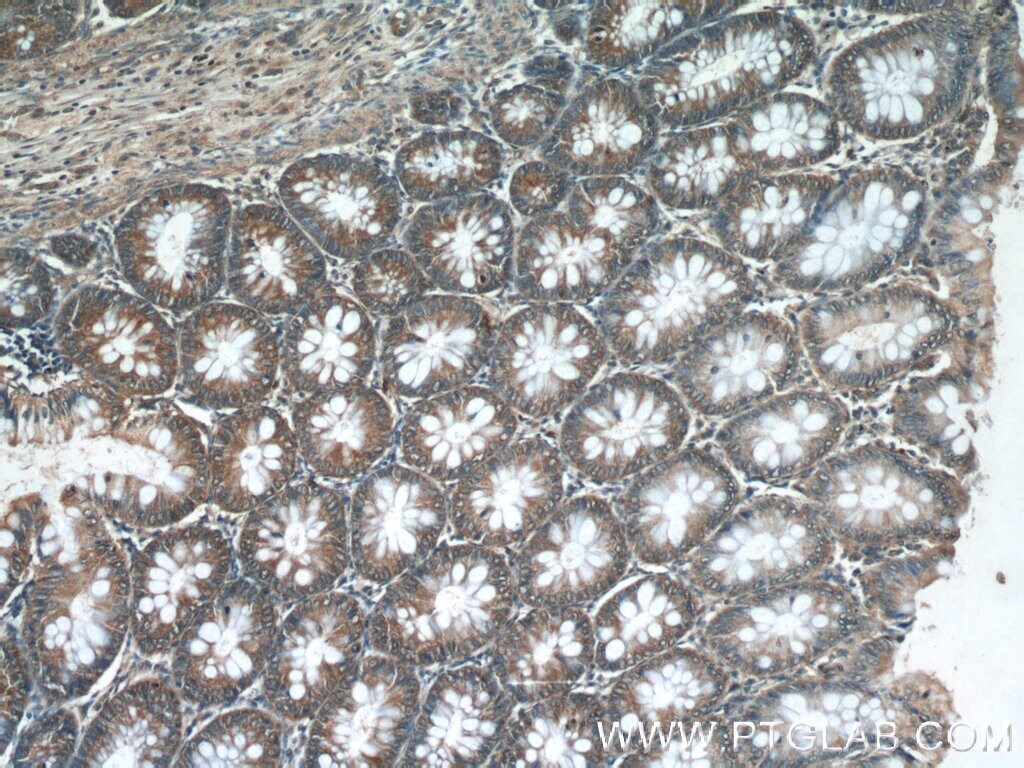 - Immunohistochemistry of paraffin-embedded human colon tissue slide using 24866-1-AP (LRCH2 Antibody) at dilution of 1:50 (under 10x lens).