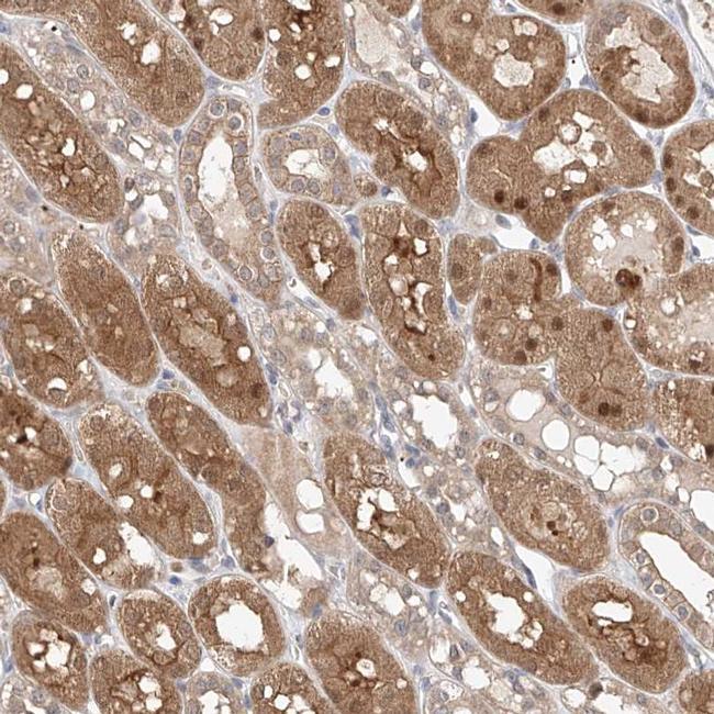 - Immunohistochemical staining of ZFHX2 in human kidney tissue shows moderate cytoplasmic and occasional nuclear positivity in tubular cells. Samples were probed using a ZFHX2 Polyclonal Antibody (Product # PA5-51445).