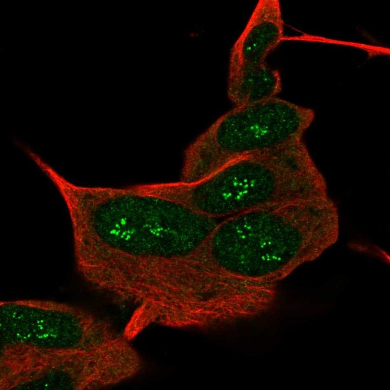 - Immunofluorescent staining of ZFHX2 in human cell line SH-SY5Y using a ZFHX2 Polyclonal Antibody (Product # PA5-51445) shows localization to nucleus, nucleoli fibrillar center and cytosol.