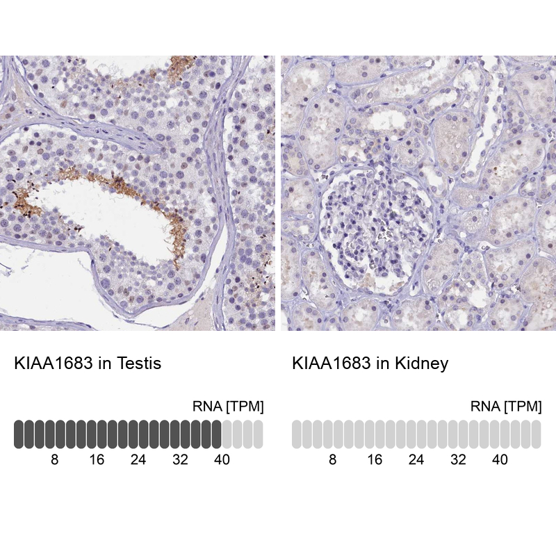 - Immunohistochemistry analysis in human testis and kidney tissues using Anti-KIAA1683 antibody. Corresponding KIAA1683 RNA-seq data are presented for the same tissues.