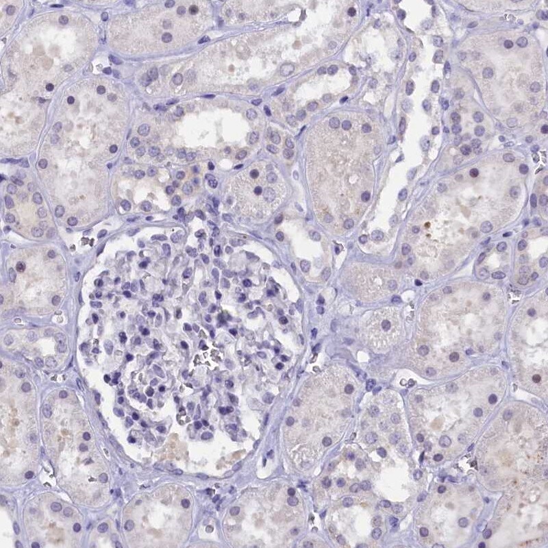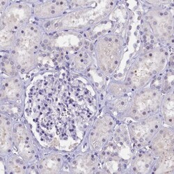 - Immunohistochemical staining of KIAA1683 in human kidney using KIAA1683 Polyclonal Antibody (Product # PA5-59972) shows low expression as expected.