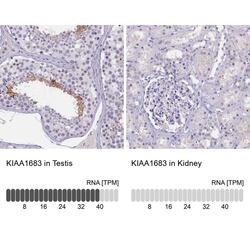 - Immunohistochemical staining of KIAA1683 in human testis and kidney tissues using KIAA1683 Polyclonal Antibody (Product # PA5-59972). Corresponding KIAA1683 RNA-seq data are presented for the same tissues.