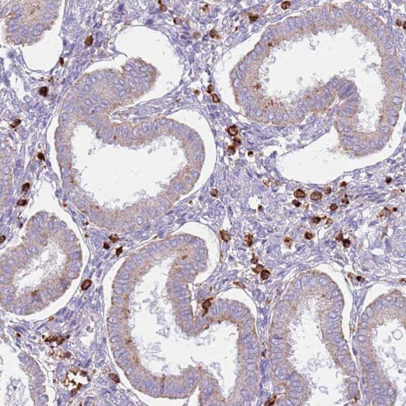 - Immunohistochemical analysis of TTPAL in human endometrium using TTPAL Polyclonal Antibody (Product # PA5-61381) shows strong cytoplasmic positivity in stromal cells.