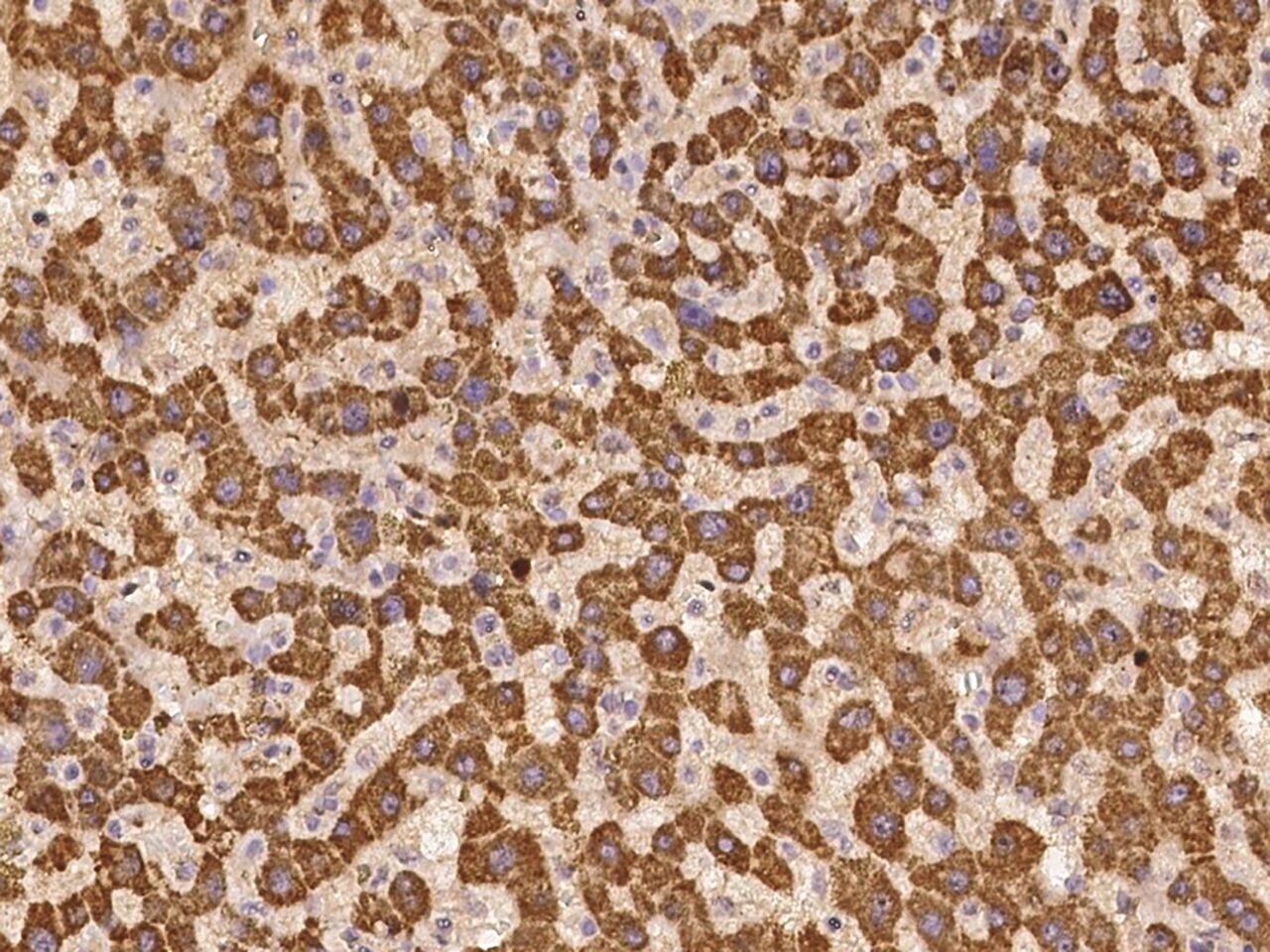 - Immunohistochemistry analysis of UNC13C in formalin-fixed paraffin embedded human liver sections. Samples were incubated with UNC13C polyclonal antibody (Product # PA5-148359) using a dilution of 1:100.