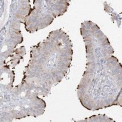 - Immunohistochemical staining of human fallopian tube with LBA1 polyclonal antibody (Cat # PAB22882) shows distinct positivity in cilia of glandular cells at 1:200-1:500 dilution.