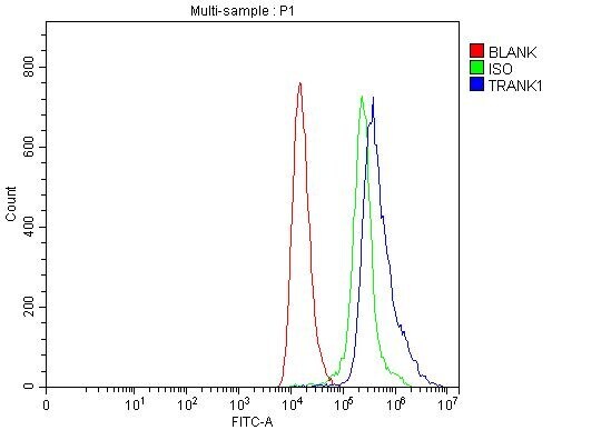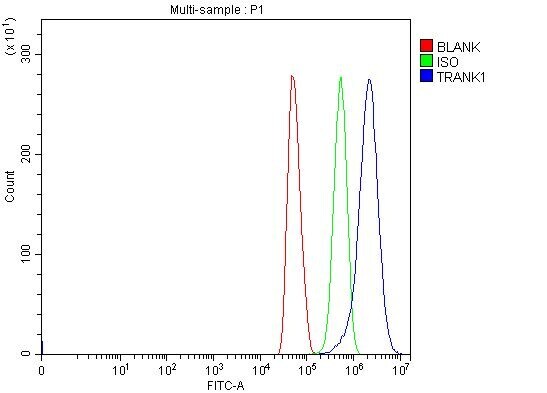 - Flow cytometry of TRANK1 in U251 cells (Blue line). The cells were blocked with 10% normal goat serum, and then incubated with TRANK1 polyclonal antibody (Product # PA5-144000) (1 µg/1x10^6 cells) for 30 min at 20°C. Isotype control antibody (Green line) was rabbit IgG (1 μg/1x10^6 cells) used under the same conditions. Unlabeled sample (Red line) was also used as a control. DyLight®488 conjugated goat anti-rabbit IgG (5-10 μg/1x10^6 cells) was used as secondary antibody for 30 minutes at 20°C.