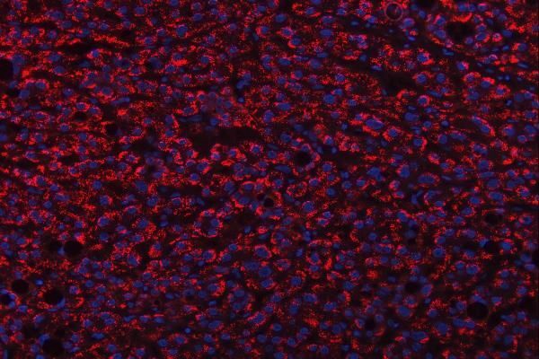 - Immunohistochemistry analysis of TRANK1 in paraffin-embedded section of human liver cancer tissue. Heat mediated antigen retrieval was performed in EDTA buffer (pH 8.0, epitope retrieval solution). The tissue section was blocked with 10% goat serum. Samples were incubated with TRANK1 Polyclonal antibody (Product # PA5-144000) using a dilution of 5 μg/mL overnight at 4°C. DyLight®550 Conjugated Goat Anti-Rabbit IgG was used as secondary antibody at 1:100 dilution and incubated for 30 minutes at 37°C. The section was counterstained with DAPI. Visualize using a fluorescence microscope and filter sets appropriate for the label used.