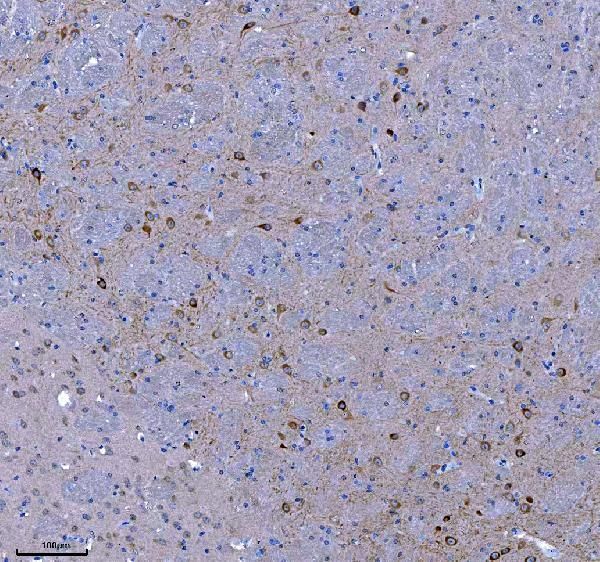 - Immunohistochemistry analysis of TRANK1 in paraffin-embedded section of rat brain tissue. Heat mediated antigen retrieval was performed in EDTA buffer (pH 8.0, epitope retrieval solution). The tissue section was blocked with 10% goat serum. Samples were incubated with TRANK1 Polyclonal antibody (Product # PA5-144000) using a dilution of 2 μg/mL overnight at 4°C. Peroxidase Conjugated Goat Anti-rabbit IgG was used as secondary antibody and incubated for 30 minutes at 37°C. The tissue section was developed using HRP Conjugated Rabbit IgG Super Vision Assay Kit with DAB as the chromogen.