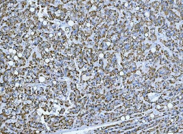 - Immunohistochemistry analysis of TRANK1 in paraffin-embedded section of human liver cancer tissue. Heat mediated antigen retrieval was performed in EDTA buffer (pH 8.0, epitope retrieval solution). The tissue section was blocked with 10% goat serum. Samples were incubated with TRANK1 Polyclonal antibody (Product # PA5-144000) using a dilution of 2 μg/mL overnight at 4°C. Peroxidase Conjugated Goat Anti-rabbit IgG was used as secondary antibody and incubated for 30 minutes at 37°C. The tissue section was developed using HRP Conjugated Rabbit IgG Super Vision Assay Kit with DAB as the chromogen.
