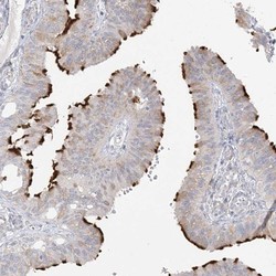 - Immunohistochemistry-Paraffin: TRANK1 Antibody [NBP1-93641] - Staining of human fallopian tube shows distinct positivity in cilia of glandular cells.