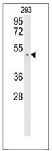 - Western blot analysis of LUZP4 Antibody (N-term) ??in 293 cell line lysates (35ug/lane).This demonstrates the LUZP4 antibody detected the LUZP4 protein (arrow).