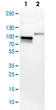 - Western blot analysis of Lane 1: NIH-3T3 cell lysate (Mouse embryonic fibroblast cells), Lane 2: NBT-II cell lysate (Rat Wistar bladder tumour cells) with SH3KBP1 polyclonal antibody (Cat # PAB29542).