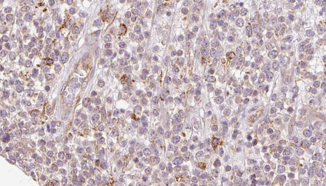 - 1:100 staining human lymph carcinoma tissue by IHC-P. The sample was formaldehyde fixed and a heat mediated antigen retrieval step in citrate buffer was performed. The sample was then blocked and incubated with the antibody for 1.5 hours at 22°C. An HRP conjugated goat anti-rabbit antibody was used as the secondary.