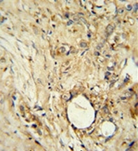 - Immunohistochemistry analysis in formalin fixed and paraffin embedded human breast carcinoma reacted with , which was?peroxidase conjugated to the secondary antibody and followed by?DAB staining.