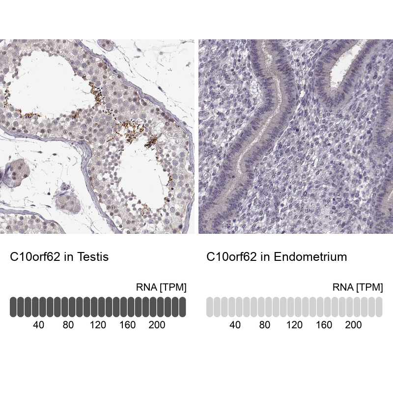 - Immunohistochemistry analysis in human testis and endometrium tissues using Anti-C10orf62 antibody. Corresponding C10orf62 RNA-seq data are presented for the same tissues.