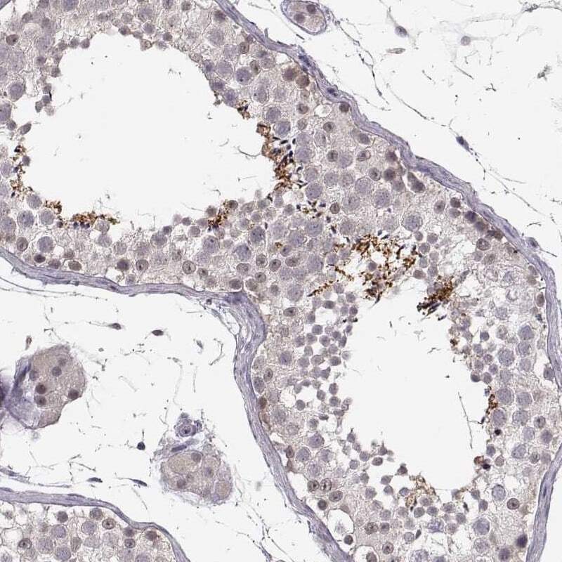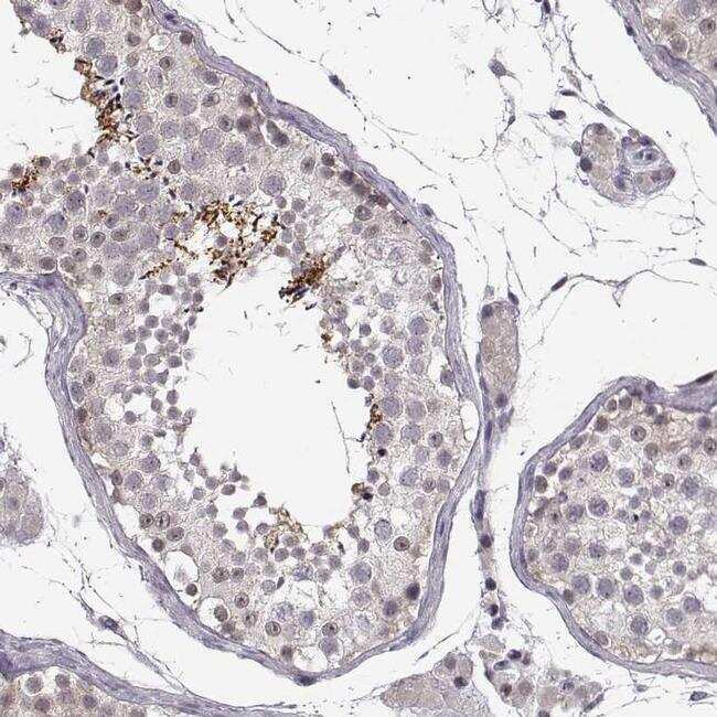 - Immunohistochemical staining of C10orf62 in human testis shows strong cytoplasmic positivity in cells in seminiferous ducts. Samples were probed using a C10orf62 Polyclonal Antibody (Product # PA5-67264).