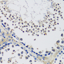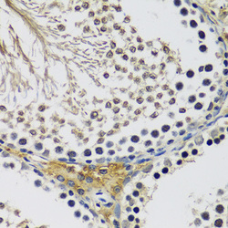 - Immunohistochemistry of paraffin-embedded mouse testis using C10orf62 antibody (STJ119423) at dilution of 1:100 (40x lens).