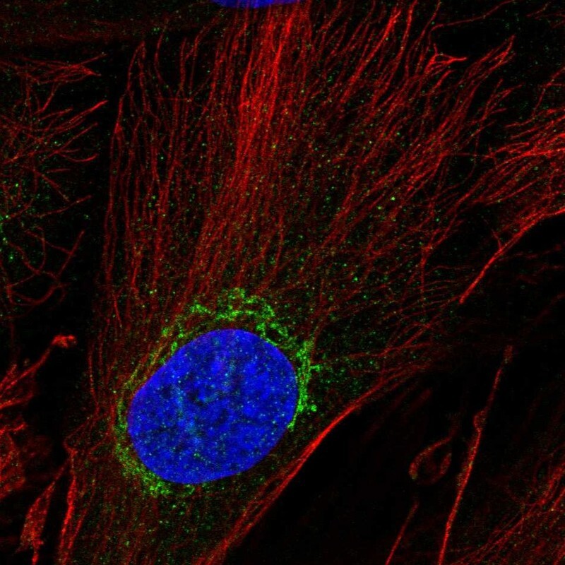 - Immunofluorescent staining of human cell line BJ shows localization to the Golgi apparatus.