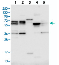 - Western blot analysis of Lane 1: RT-4, Lane 2: U-251 MG, Lane 3: Human Plasma, Lane 4: Liver, Lane 5: Tonsil with C15orf52 polyclonal antibody (Cat # PAB23858) at 1:250-1:500 dilution.