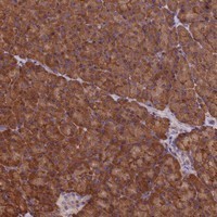 - Immunohistochemical staining of human pancreas with C15orf52 polyclonal antibody (Cat # PAB23858) shows strong cytoplasmic positivity in exocrine glandular cells at 1:200-1:500 dilution.