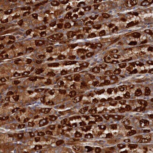 - Immunohistochemical analysis of TMEM196 in human stomach, lower using TMEM196 Polyclonal Antibody (Product # PA5-60264) shows strong cytoplasmic positivity in parietal cells.
