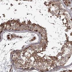 - Immunohistochemical staining of THAP9 in human testis using a THAP9 Polyclonal Antibody (Product # PA5-57947) shows distinct cytoplasmic in cells in seminiferous ducts.