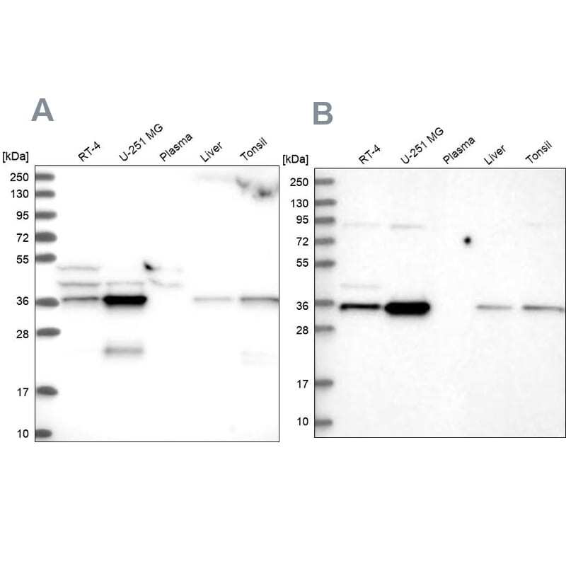 - Western blot analysis of GPATCH11 using GPATCH11 Polyclonal Antibody (Product # PA5-58306) (A) shows similar pattern to an independent GPATCH11 Polyclonal Antibody (B).
