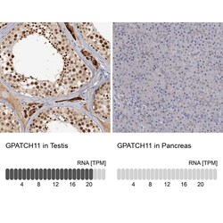 - Immunohistochemical staining of GPATCH11 in human testis and pancreas tissues using GPATCH11 Polyclonal Antibody (Product # PA5-58306). Corresponding GPATCH11 RNA-seq data are presented for the same tissues.