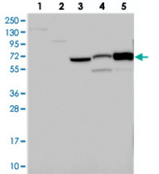 - Western blot analysis of Lane 1: RT-4, Lane 2: U-251 MG, Lane 3: Human Plasma, Lane 4: Liver, Lane 5: Tonsil with CNNM1 polyclonal antibody (Cat # PAB23655).