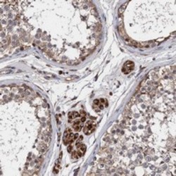 - Immunohistochemical staining of human testis with CNNM1 polyclonal antibody (Cat # PAB23655) shows moderate cytoplasmic positivity in cells in seminiferus ducts and strong positivity in Leydig cells at 1:1000-1:2500 dilution.