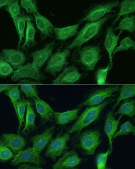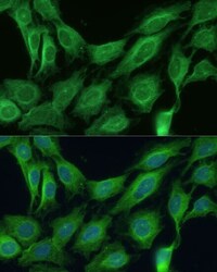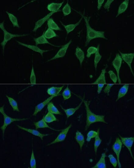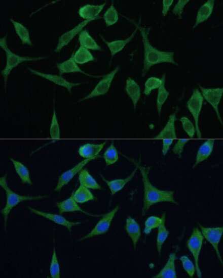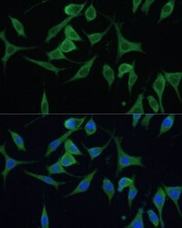 - Immunofluorescence analysis of CNNM1 in L929 cells. Samples were incubated with CNNM1 Polyclonal antibody (Product # PA5-120530) using a dilution of 1:100. Blue: DAPI for nuclear staining.