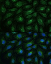 - Immunofluorescence analysis of CNNM1 in U-2 OS cells. Samples were incubated with CNNM1 Polyclonal antibody (Product # PA5-120530) using a dilution of 1:100. Blue: DAPI for nuclear staining.