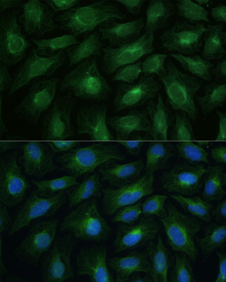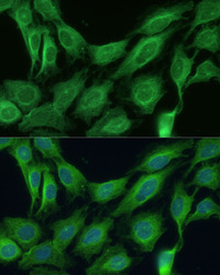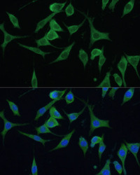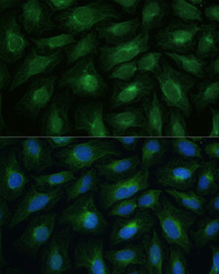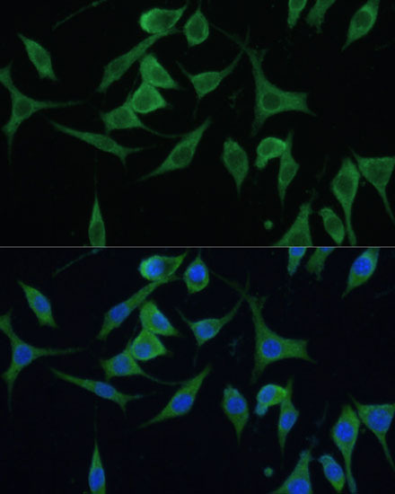 - Immunofluorescence analysis of L929 cells using CNNM1 antibody (STJ11102855) at dilution of 1:100. Blue: DAPI for nuclear staining.